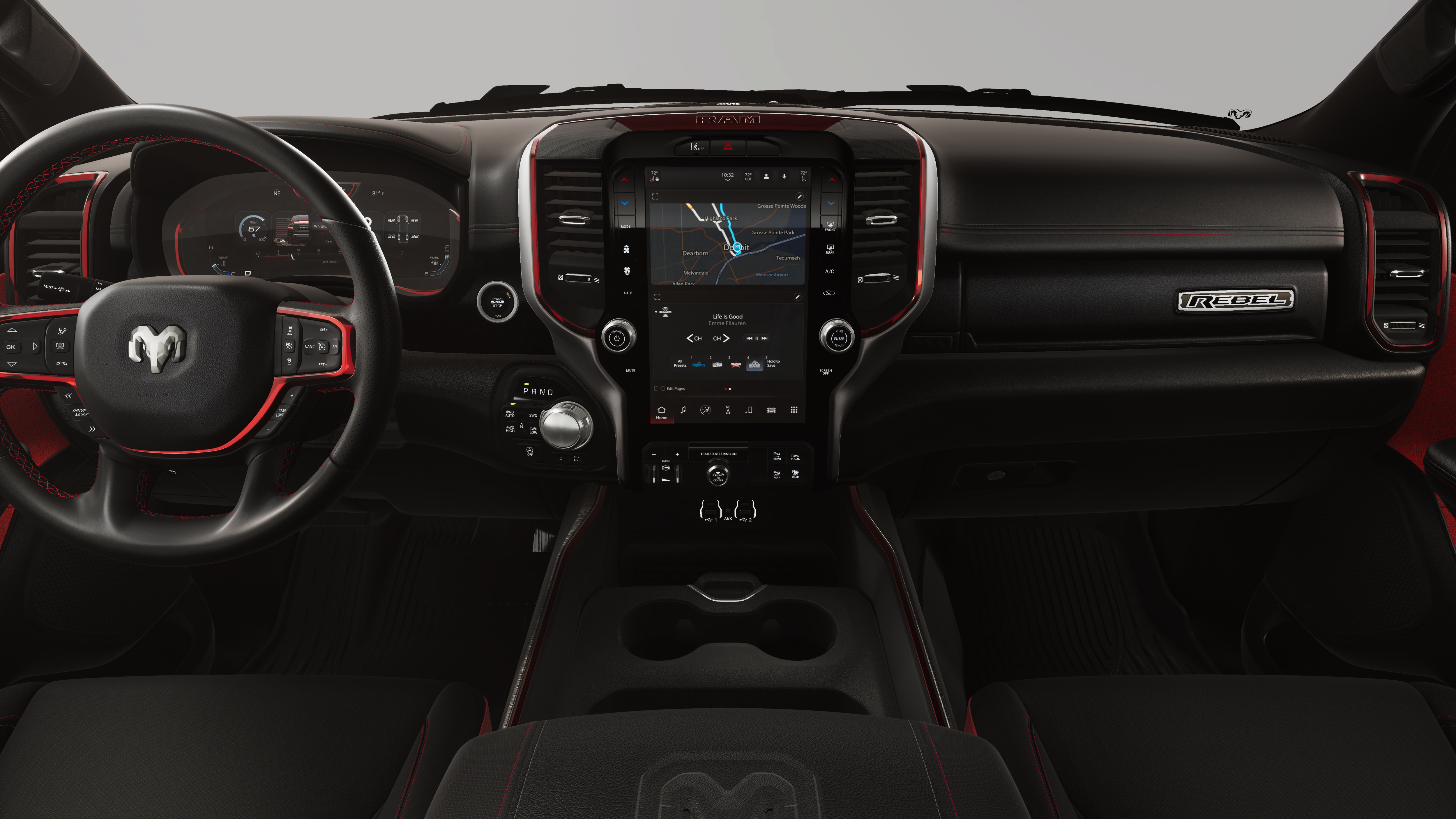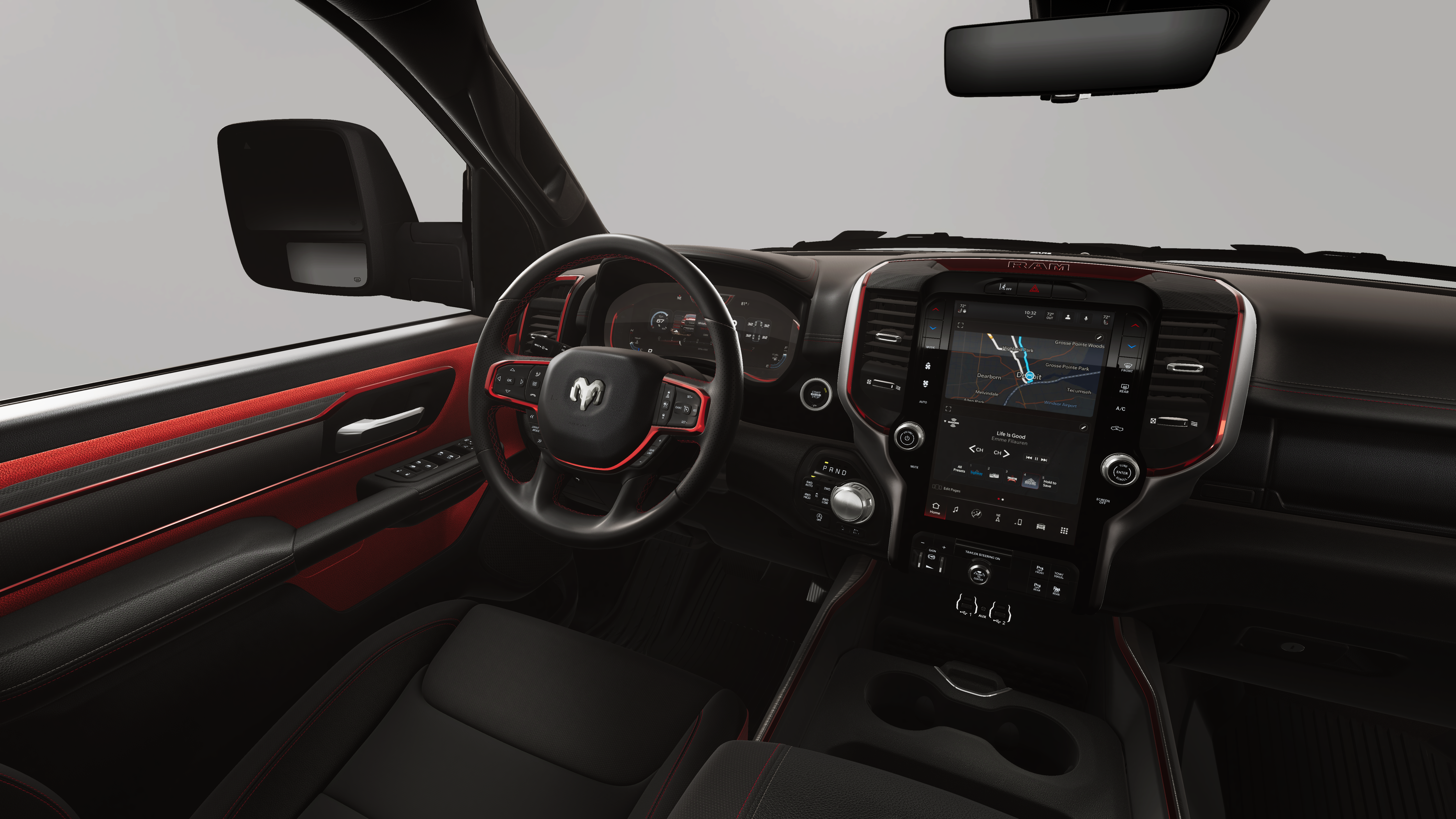 REBEL LEVEL 1 EQUIPMENT GROUP Rear Window Defroster, Wireless Charging Pad, Power Adjustable Pedals, Exterior Mirrors w/Supplemental Signals, Exterior Mirrors Courtesy Lamps, Auto Power-Folding Mirrors, Remote Tailgate Release, Auto Dim Exterior Driver Mirror, Black Premium Power Mirrors, TRANSMISSION: 8-SPEED AUTOMATIC (8HP75) (STD), ENGINE: 3.0L I6 HURRICANE SO TWIN TURBO ESS (STD). Ram Rebel with Canyon Lake exterior and Red/Black interior features a Straight 6 Cylinder Engine with 420 HP at 5200 RPM*.